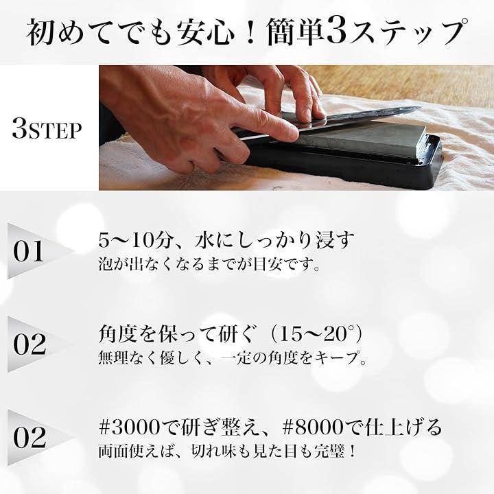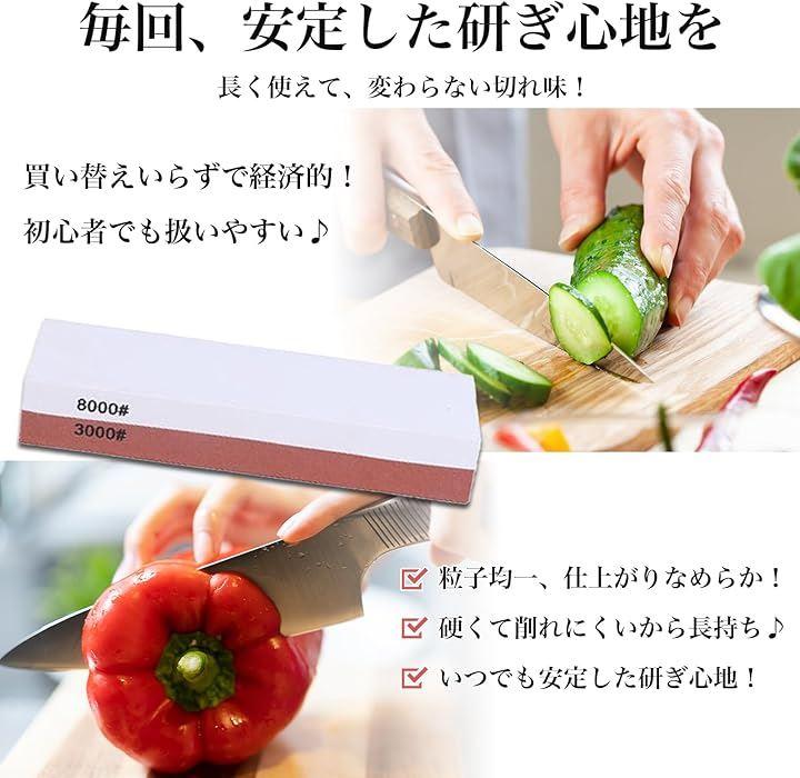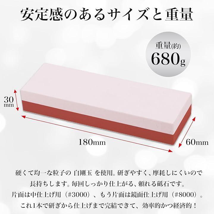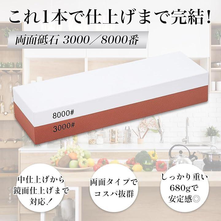 粒度は#3000(中仕上げ)と#8000(鏡面仕上げ)の2面構造で、包丁やハサミなどの刃物を滑らかに、鋭く整えることができます。