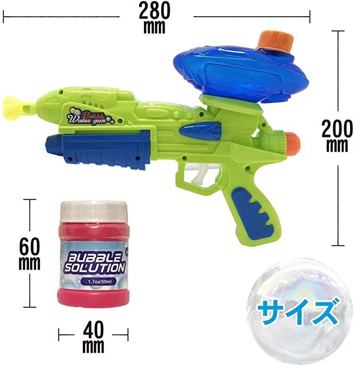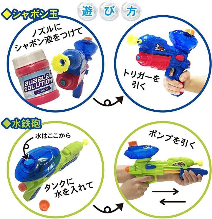 ・「色々な遊び方」しゃぼん玉、水鉄砲それぞれの遊び方はもちろんできますが、このウォーターバブルガンは2WAYなので自分で作ったしゃぼん玉を水鉄砲で打つ。こんな遊び方もできるお得なおもちゃです。