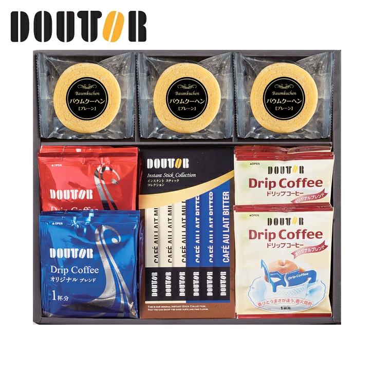 バウムクーヘン、ドトールまろやかカフェ・オ・レ13g、ドトールほろにがカフェ・オ・レ7g×各3、ドトールドリップコーヒークラシックブレンド、ドトールドリップコーヒーオリジナルブレンド(青)各7g×4、ドトールコーヒーオリジナルブレンド7g×8