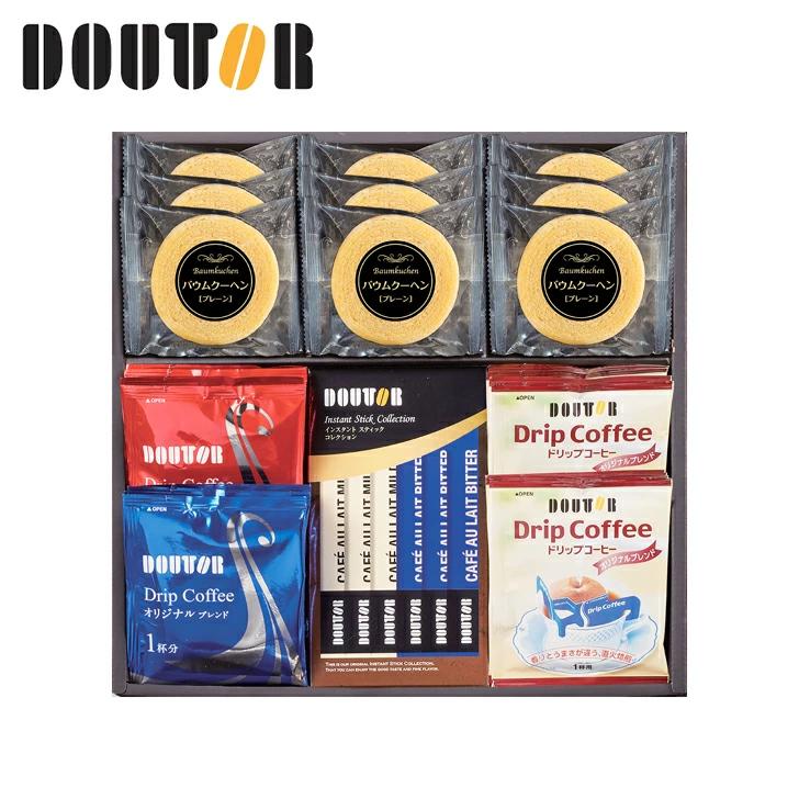 バウムクーヘン×9、ドトールまろやかカフェ・オ・レ13g、ドトールほろにがカフェ・オ・レ7g×各3、ドトールドリップコーヒークラシックブレンド、ドトールドリップコーヒーオリジナルブレンド(青)各7g×4、ドトールドリップコーヒーオリジナルブレンド7g×8
