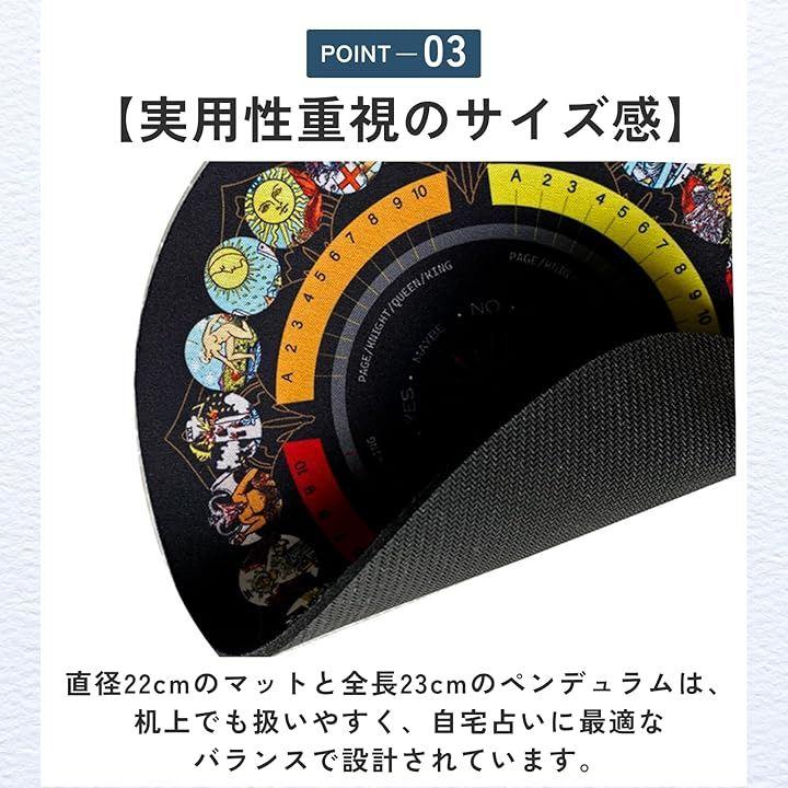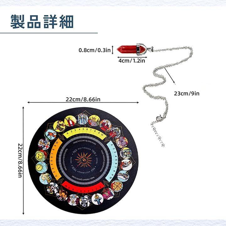 「実用性重視のサイズ感」直径22cmのマットと全長23cmのペンデュラムは、机上でも扱いやすく、自宅占いに最適なバランスで設計されています。
