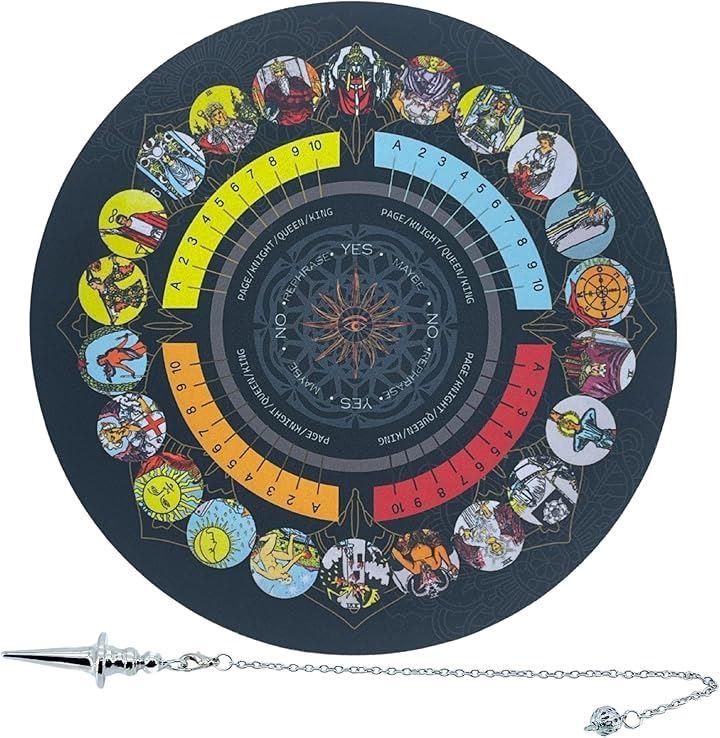 「タロット柄のダウジングマット」パッドタイプのダウジングチャートシートと、シルバーペンデュラム振り子のセット。