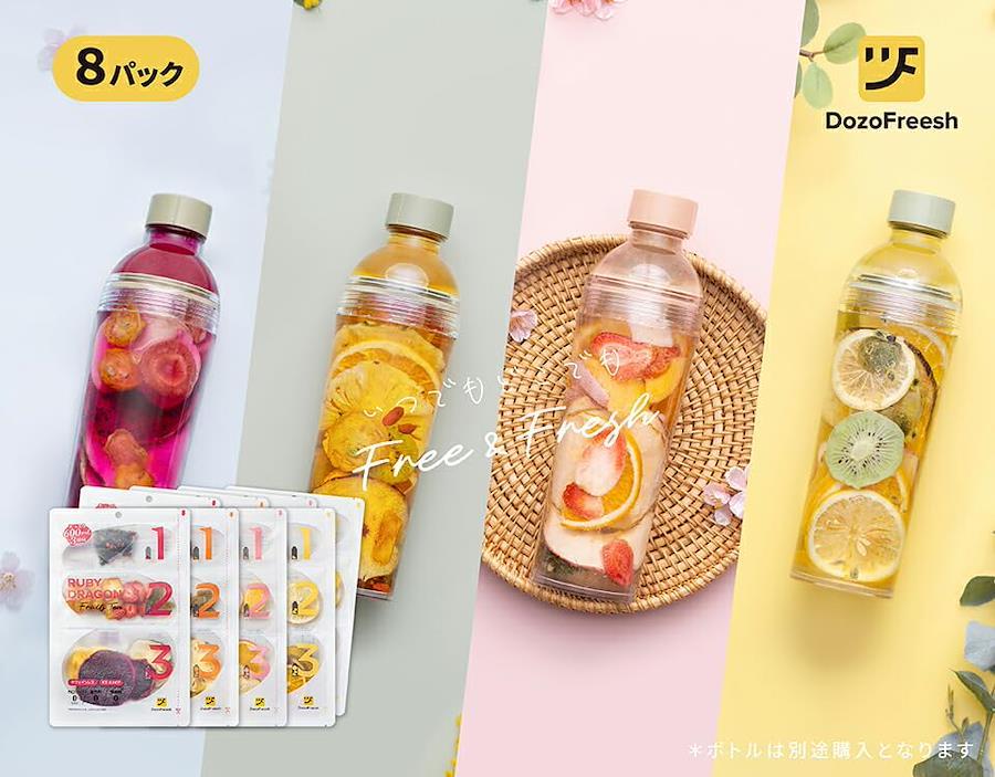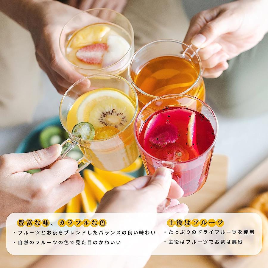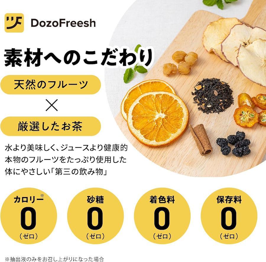 カロリーゼロ、ノンカフェイン砂糖不使用、無添加(着色料不使用、保存料不使用)新鮮なフルーツのフリーズドライ・低温乾燥のドライフルーツと、相性の良い茶葉を組み合わせた「Dozo Freesh Fruits Tea」全4種。水より美味しい、コーヒーよりカフェインレス、カロリー0(ゼロ)でジュースより健康な「第3の飲み物」として、カフェインレスでヘルシーなフルーツティー。オススメな飲み方≫ COLDの場合は、水もしくは炭酸水を注ぎ入れますオススメな場面≫ ジム デスクワーク 休憩時間 ランニング 温泉 ヨガ 焼き肉と【重要】メーカーによる商品リニューアルに伴いパッケージ(内容量も含む)変更が行われた場合、新パッケージでお届け致します事ご了承願います。
