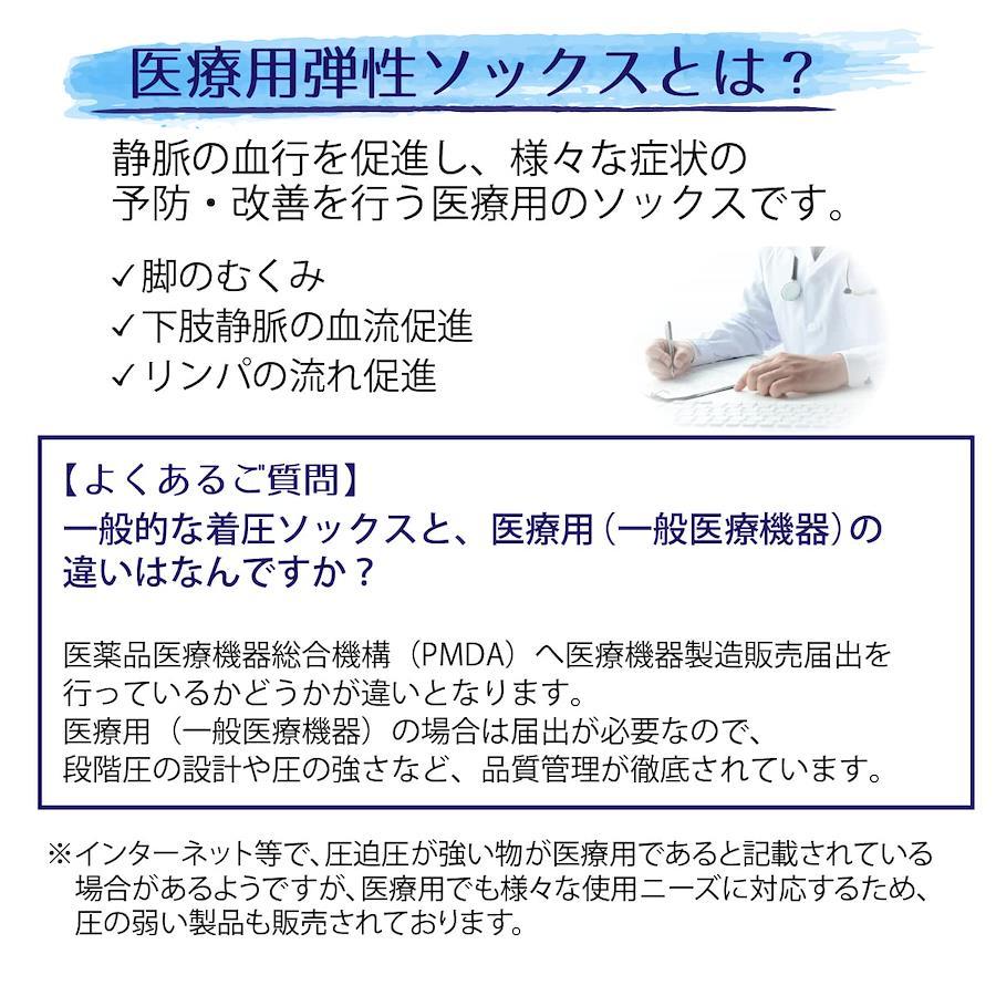 【一般医療機器】弾性ストッキング(製造販売届出番号:18B3X10028000044) 【医療機関取扱品】脚のむくみ対策(下肢の静脈血、リンパ液のうっ滞を軽減または予防)に 【組成:ナイロン、綿、ポリウレタン、ポリエステル】綿混素材使用で、肌の弱い方にもおすすめです。 【男女兼用】立ち仕事や座り仕事の方、男性や、妊婦さんにもおすすめです。 【日本製】日本国内の品質管理の徹底した工場で製造しています。