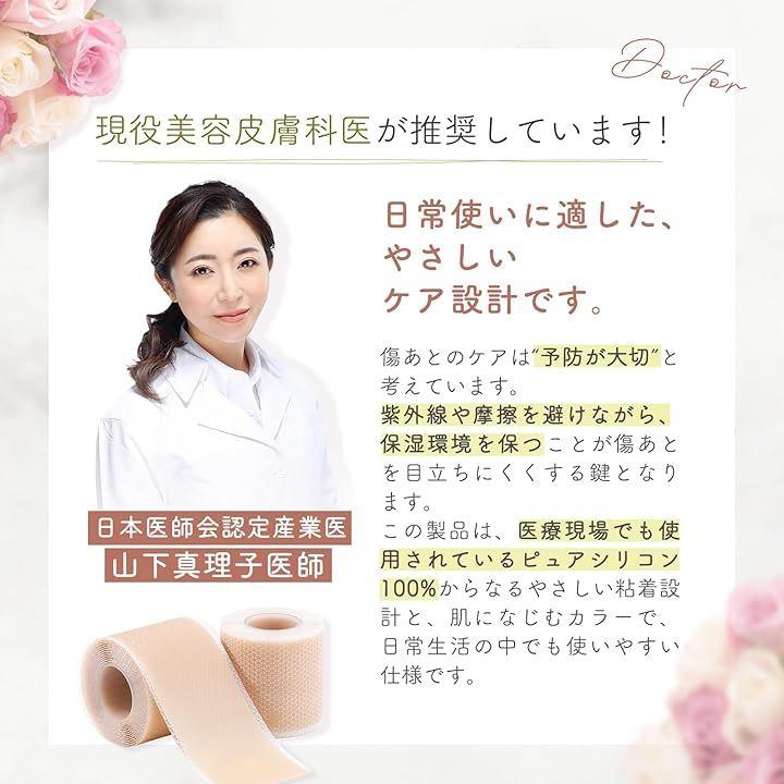 「現役美容皮膚科医監修・美容外科医院取扱い品」 美容医療の現場でも採用されているDr.ホムケアの「肌にやさしい傷あとケアテープ」は、現役の美容皮膚科医が監修した、肌へのやさしさと効果を両立したシリコン製傷跡ケアテープです。