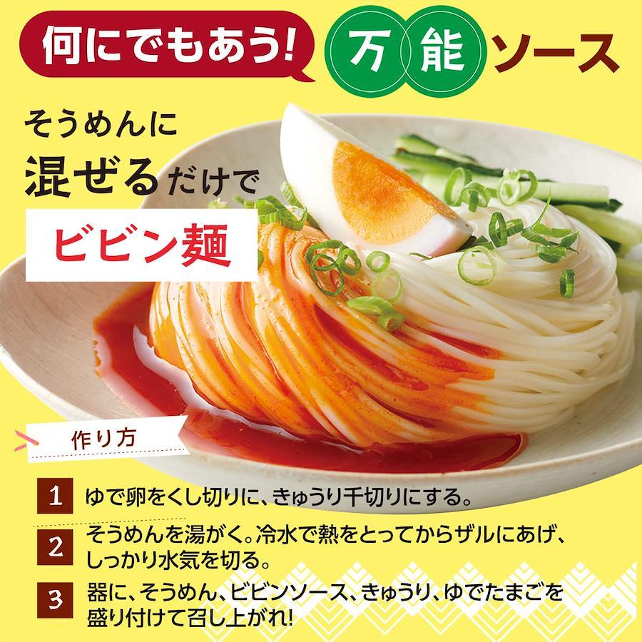 3営業日以内に発送≪新品未開封品≫本場韓国の味をご家庭で簡単に再現できる渾身の調味料。そうめんにネギやきゅうり、ゆで卵などお好みでトッピングし、甘辛いビビンソースをかけるだけで簡単ビビン麺の出来上がりです。唐揚げやサラダにかけるのはもちろん、お刺身も美味しくお召し上がりいただけます。その他、ナムルやカップ麺の味変、冷奴にかけても絶品です。容量:255g【重要】メーカーによる商品リニューアルに伴いパッケージ(内容量も含む)変更が行われた場合、新パッケージでお届け致します事ご了承願います。