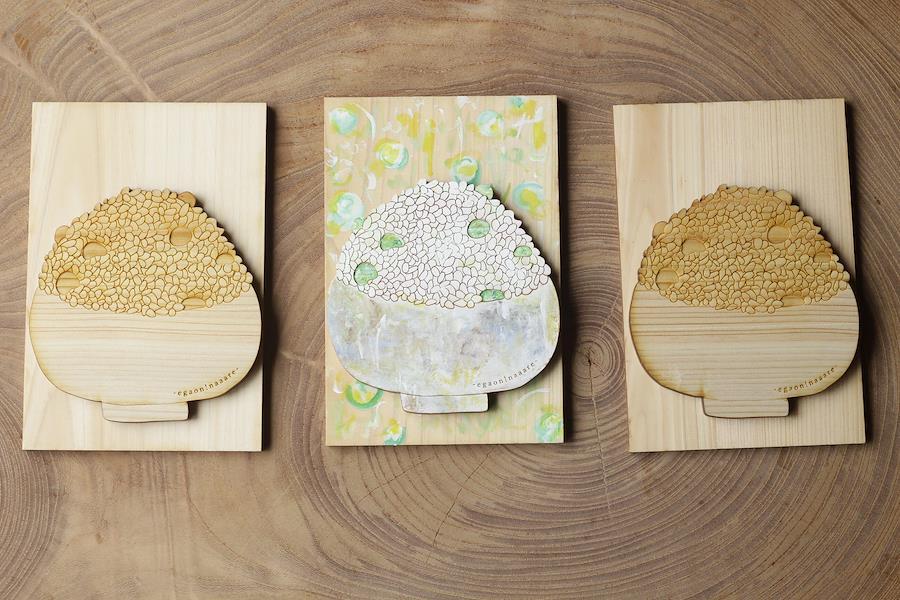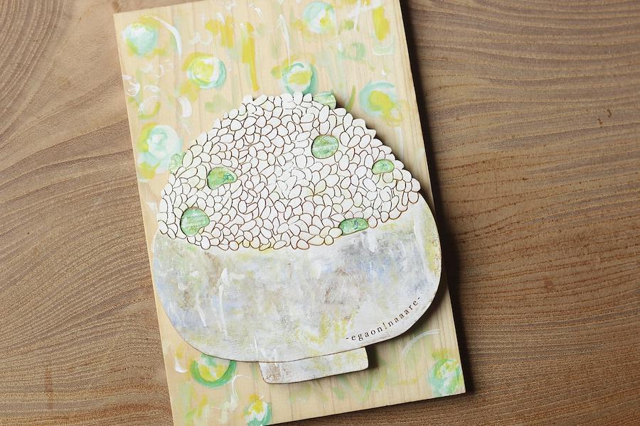 豆ごはんをモチーフにしたハガキです。お好きな画材で色を重ねることで立体感が増します。*掲載写真には、アクリル絵の具を使用しています。