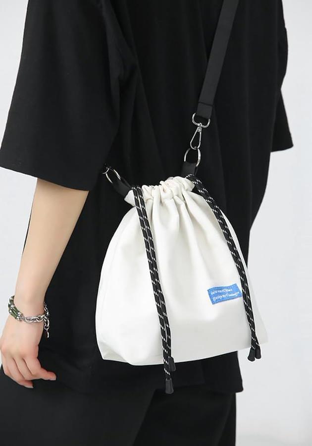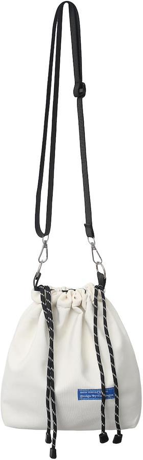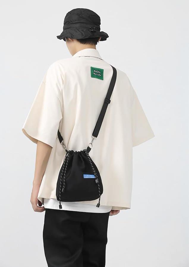 デザイン性: ドローストリング式の巾着型ショルダーバッグで、スタイリッシュでミニマムなデザインを採用