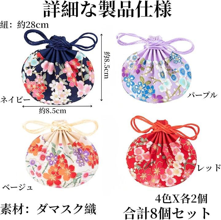 詳細な製品仕様 4色計8点セット、サイズは約8.5cmx8.5cm、紐の長さ約28cm。