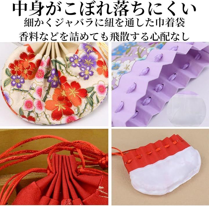 中身がこぼれにくい安心設計 細かくジャバラ状に紐を通しているため、口紐を絞るだけで中身がこぼれにくく、香袋として香料や匂い玉を入れても安心です。