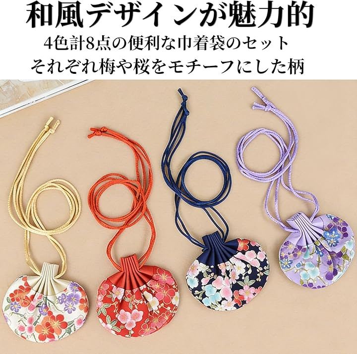 シックでクラシカルなネイビー、優しいパープル、肌なじみの良いベージュ、可愛らしいレッドの4色セットで、梅や桜の和風モチーフが色鮮やかに描かれています。