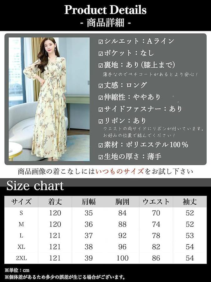 「サイズ(着丈/肩幅/胸囲/ウエスト/袖丈[cm])」S(120/35/84/70/52) M (120/36/88/74/52) L (121/37/92/78/53) XL (121/38/96/82/54) 2XL (121/39/100/86/54)*平置き採寸のため若干の誤差が生じる場合がございます。
