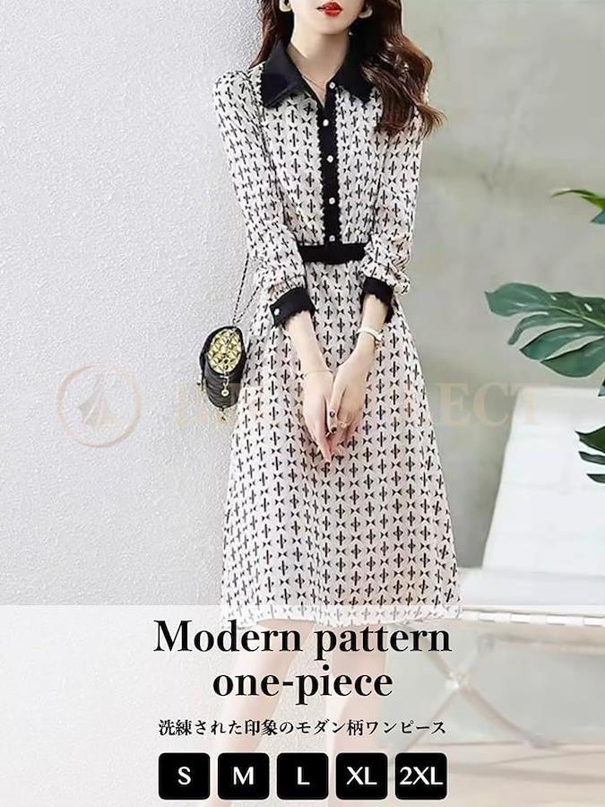 一枚で洗練された雰囲気を演出するモダン柄のワンピース。柄はもちろん、襟や袖に施された刺繍の繊細さや、ボタンの光沢感によって高見えするアイテムです。