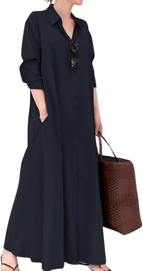 Dress, shirt, long, plain, maxi length, casual, women's, black, figure-covering, V-neck, loose, tunic, pretty, A-line, 2-way, dress, with buttons