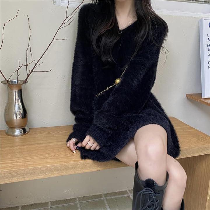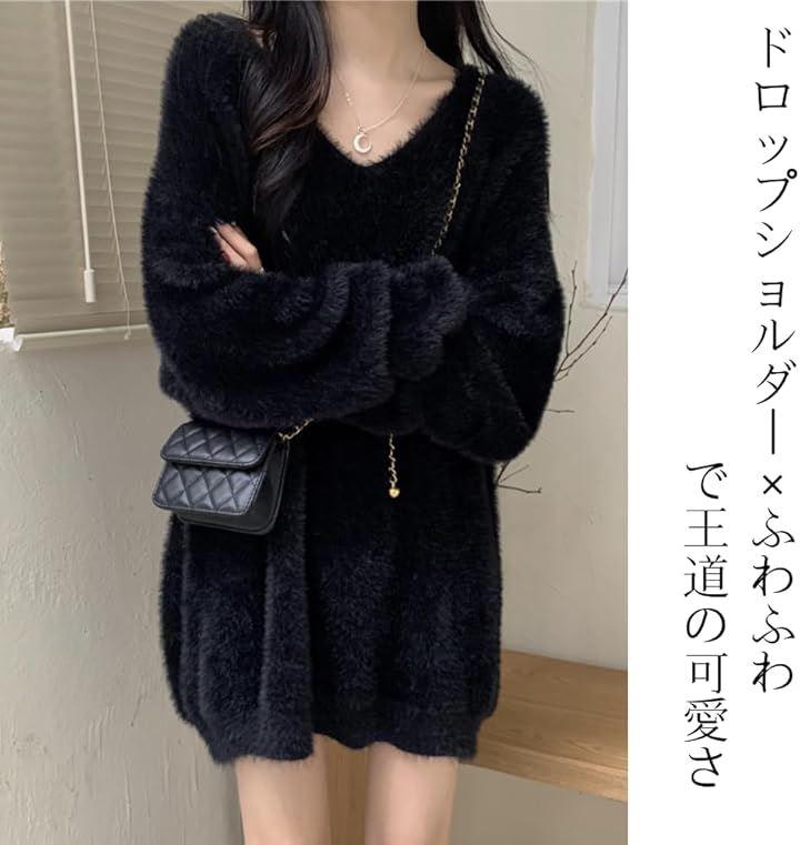 「ふわふわニットのミニワンピース」胸元を大きく見せるVネックのドロップショルダーと、ビッグシルエットのデザインが特徴的なふわふわ質感のミニワンピースです。