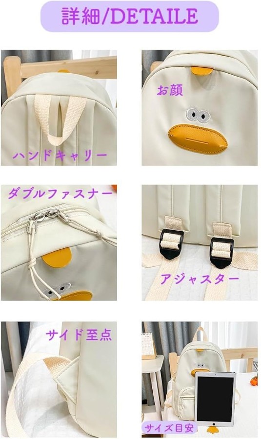 [可愛さと実用性を両立したアヒルモチーフのアニマルリュック] 愛らしいアヒル(ダック)フェイスと立体的なくちばし・足パーツをあしらったデザインは、子どもから大人まで目を引くユニークなアクセント。