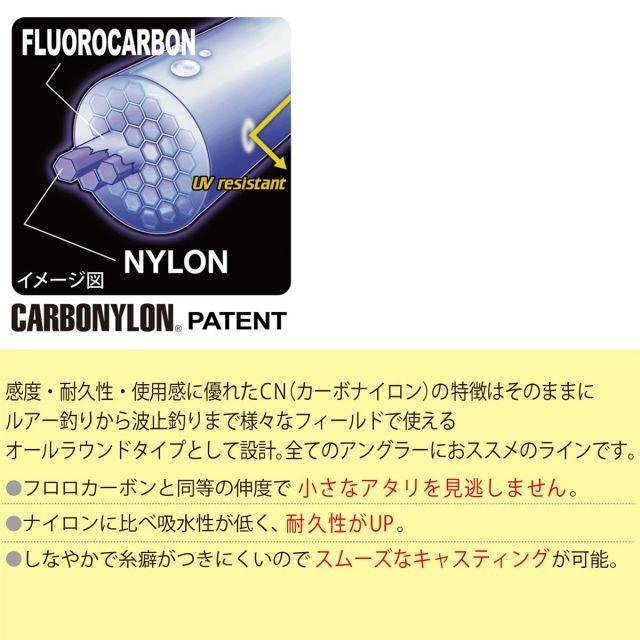 【CARBONYLONPATENT】:感度・耐久性・使用感に優れたCN(カーボナイロン)の特徴はそのままに、ルアー釣りから波止釣りまで様々なフィールドで使えるオールラウンドタイプとして設計。全てのアングラーにおススメのラインです。