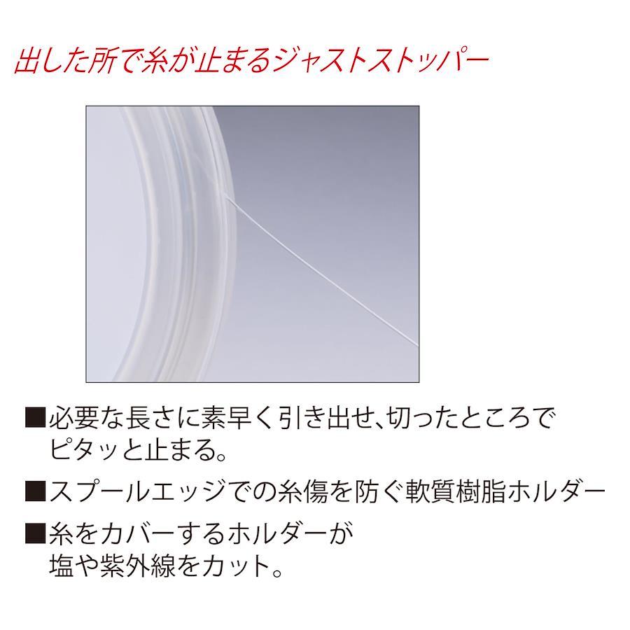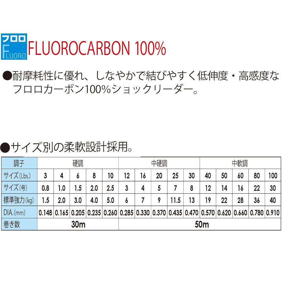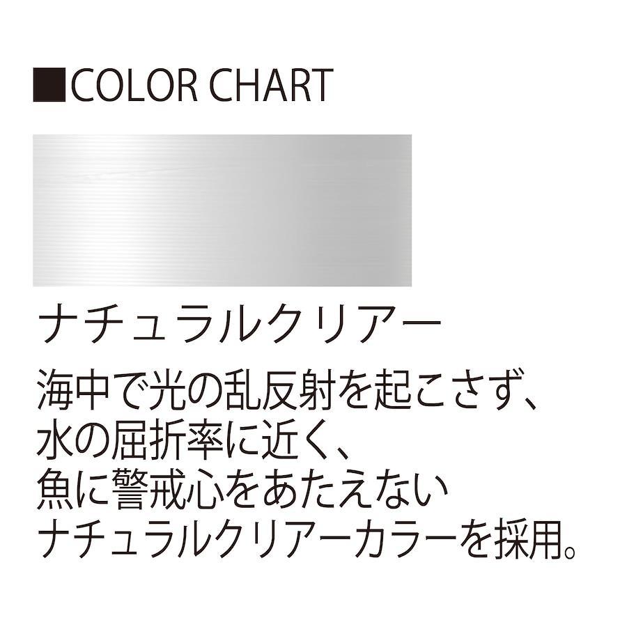 海中で光の乱反射を起こさず、水の屈折率に近く、魚に警戒心をあたえないナチュラルクリアーカラーを採用。耐磨耗性に優れ、しなやかで結びやすく低伸度・高感度なフロロカーボン100%ショックリーダーサイズ別の柔軟度設計採用。中硬調(12~30Lbs.)しなやかなのにハリとコシを備え、伸びが少なく感度良好。中軟調(40 ~100 Lbs.)太糸特有の強すぎるハリを抑え、巻きグセがつきにくい。ノットもスムーズ。ソフトな中に適度なコシ。耐ショック性向上。