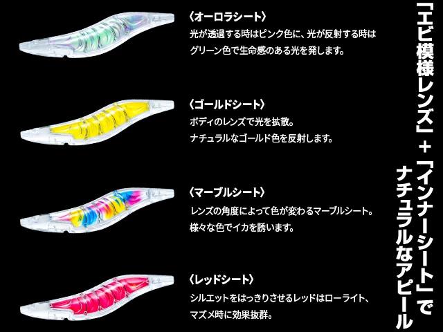 エビを再現する各パーツに加え、インナーシートの反射光がレンズを通して生命感のあるナチュラルな光になり、イカを誘います。