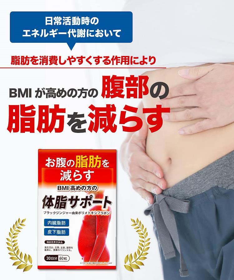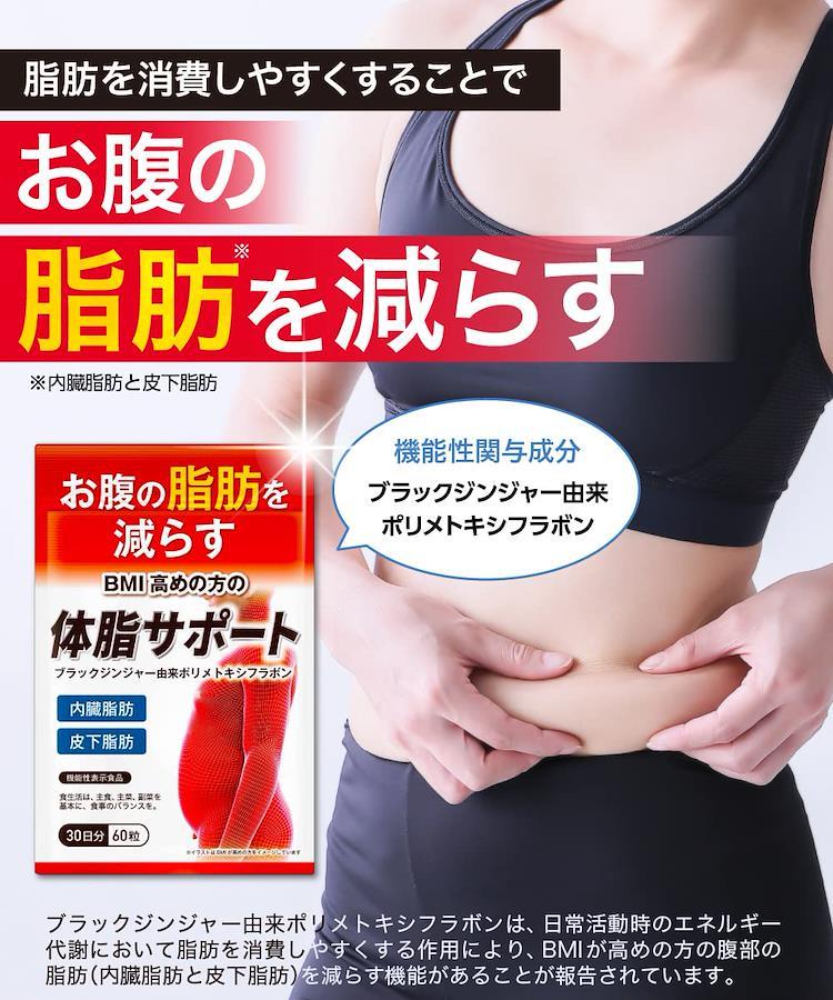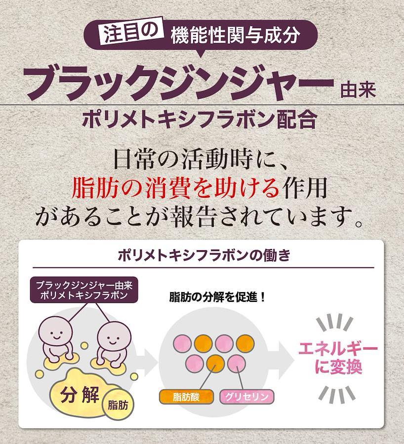 ■サイズ:??14.7x9.6x1.21cm;20g体脂サポートにはブラックジンジャー由来ポリメトキシフラボンが含まれます。ブラックジンジャー由来ポリメトキシフラボンは、日常活動時のエネルギー代謝において脂肪を消費しやすくする作用により、BMIが高めの方の腹部の脂肪(内臓脂肪と皮下脂肪)を減らす機能があることが報告されています。 【体脂サポート】にはブラックジンジャー由来ポリメトキシフラボンが含まれます。ブラックジンジャー由来ポリメトキシフラボンは、日常活動時のエネルギー代謝において脂肪を消費しやすくする作用により、BMIが高めの方の腹部の脂肪(内臓脂肪と皮下脂肪)を減らす機能があることが報告されています。 【お召し上がり方】1日2粒を目安に水または、ぬるま湯で、噛まずにお召し上がりください。 ・食生活は、主食、主菜、副菜を基本に、食事のバランスを。 ■重要なお知らせ