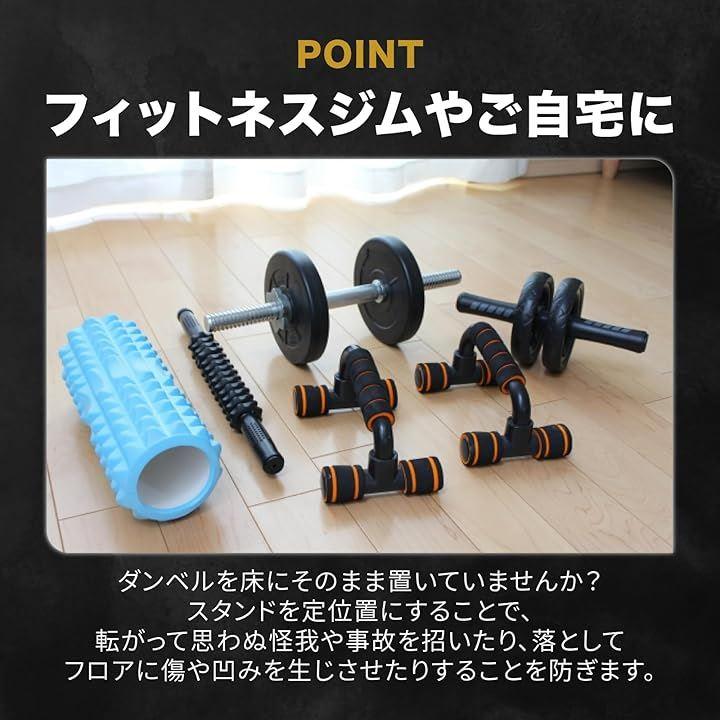 「フィットネスジムやご自宅に」ダンベルを床にそのまま置いていませんか?スタンドを定位置にすることで、転がって思わぬ怪我や事故を招いたり、落としてフロアに傷や凹みを生じさせたりすることを防ぎます。