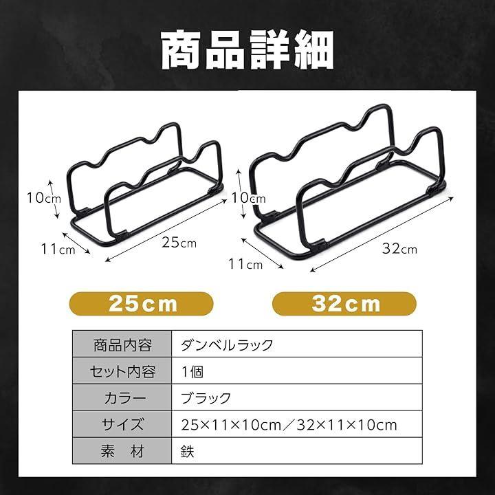 「商品内容」ダンベルラック「セット内容」1個「カラー」ブラック 「サイズ」25x11x10cm/32x11x10cm「素材」鉄 *モニターの環境により、色の見え方に若干差が生じる場合がございます。