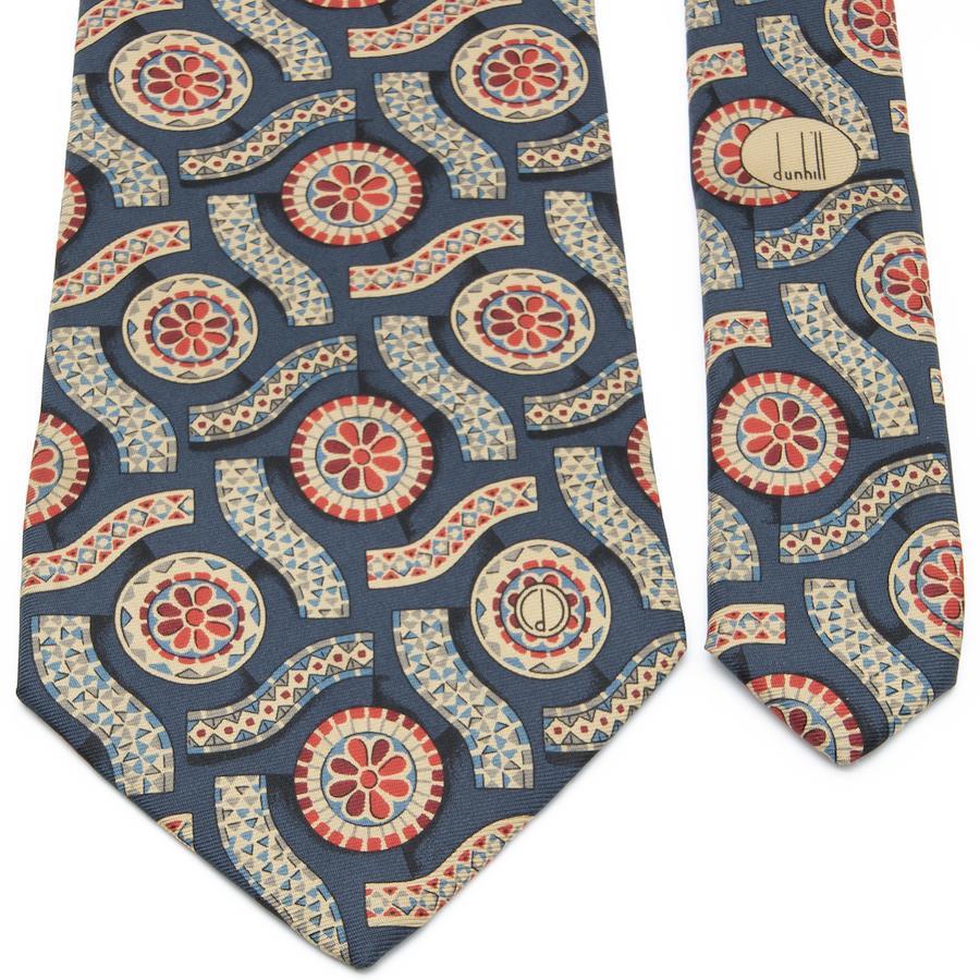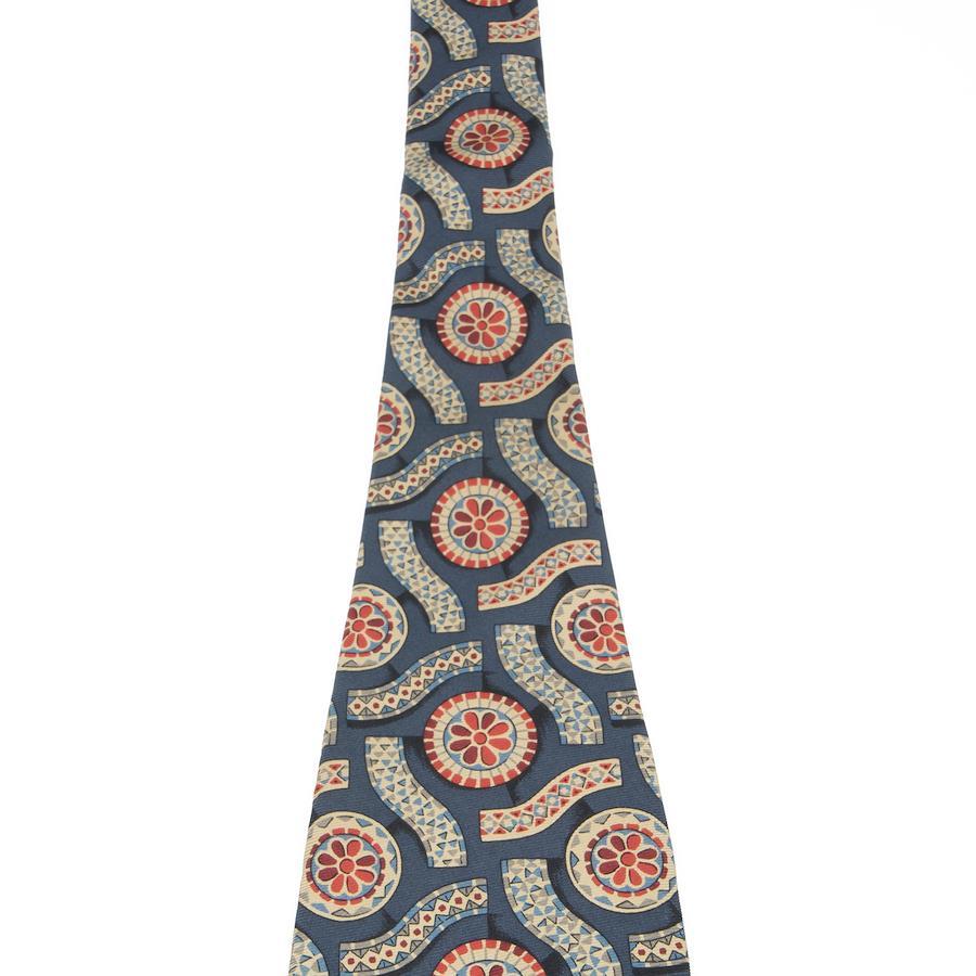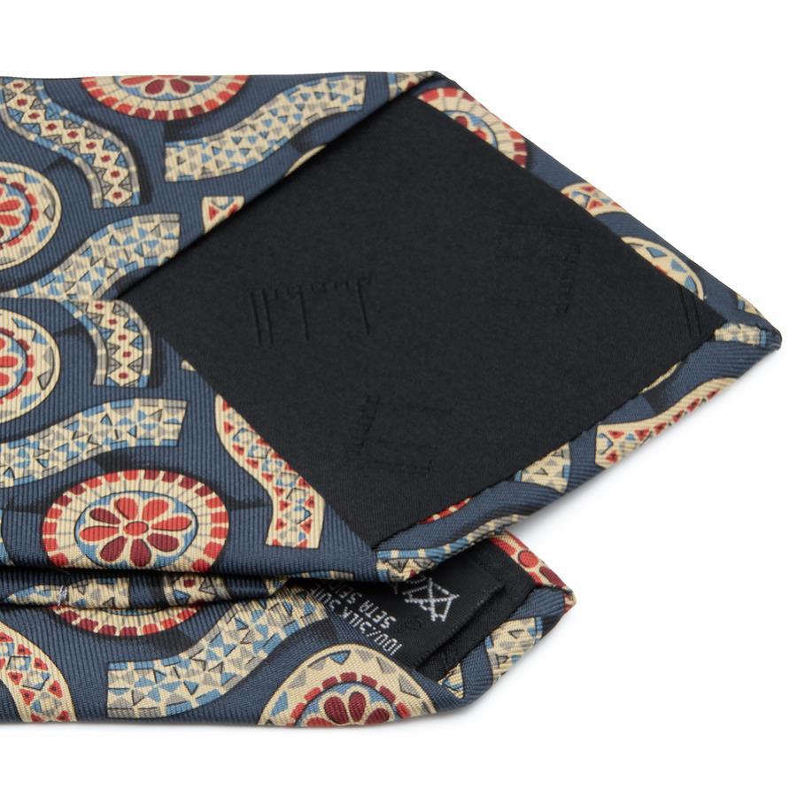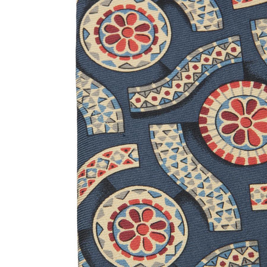こちらのネクタイは、深みのあるブルーを基調に、水色やバーガンディー、レッドの色彩で描かれた花と円の幾何学模様で、お客様の胸元に知的な華やかさを添えます。