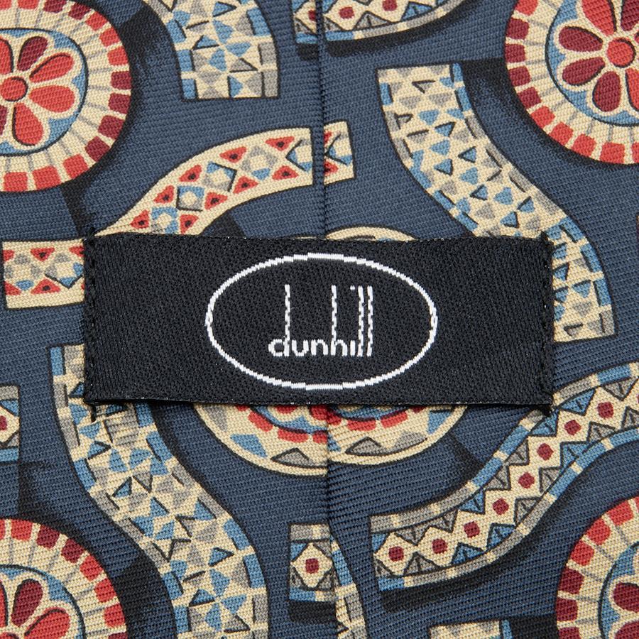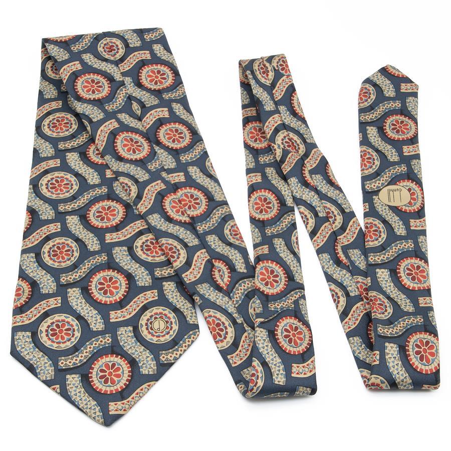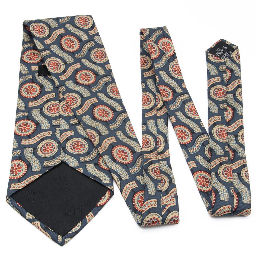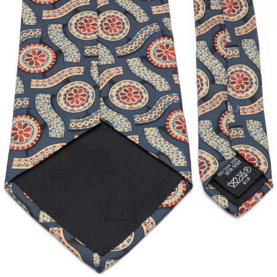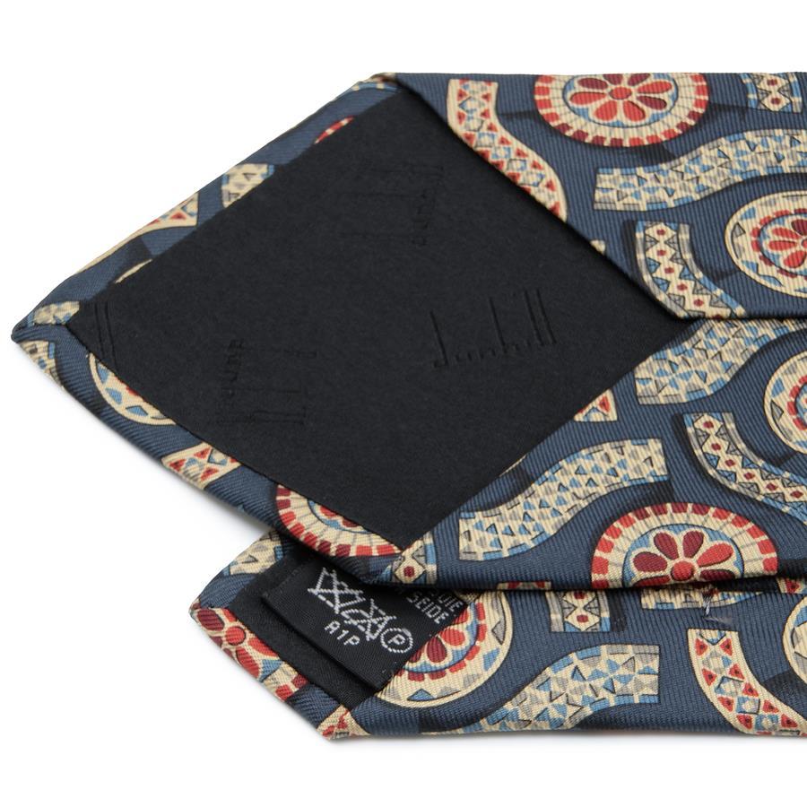 こちらのネクタイは、深みのあるブルーを基調に、水色やバーガンディー、レッドの色彩で描かれた花と円の幾何学模様で、お客様の胸元に知的な華やかさを添えます。