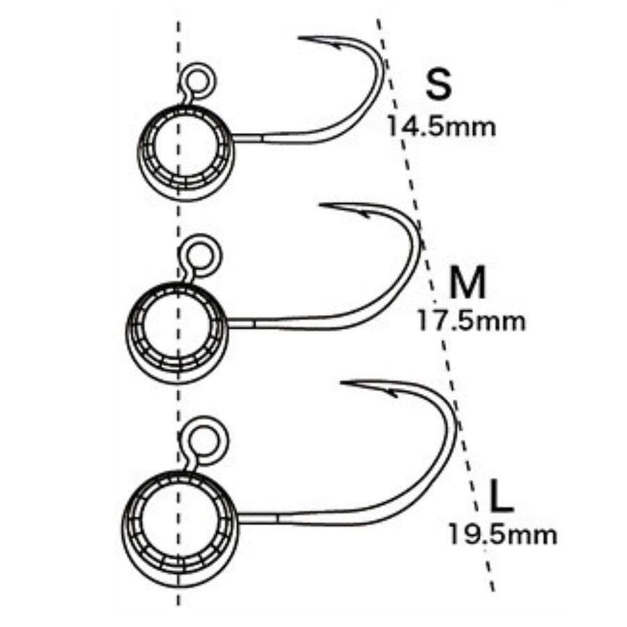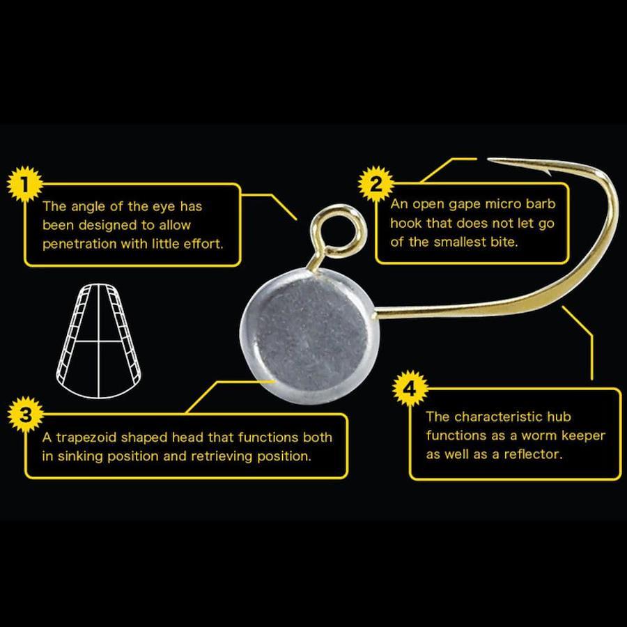 唯一無二!!完全オリジナルの日本製フックは胴打ち加工がされているので、フラッシング効果があり、クリアー系カラーとの相性抜群!さらに幅広部分がワームをホールドし、ズレを軽減できる。こだわりの内側に入ったアイの角度・オープンゲイプは絶妙なバランスでもフッキングする。まさに全てが計算しつくされた唯一無二のジグヘッドとなっている。