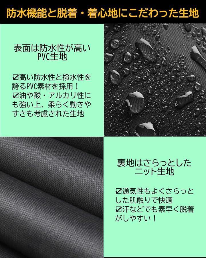 「防水性と着心地にこだわった生地」 表地はPVC・裏地はニット生地を使用しており防水性とともに中の湿気を排出可能な機能性素材。