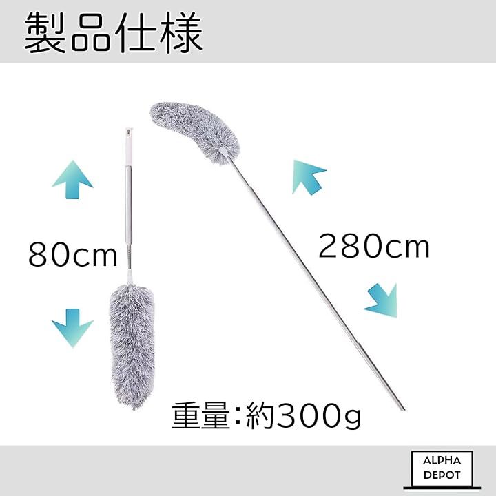 「製品仕様」ステンレスポール本体x1 + マイクロファイバーヘッドx1 <サイズ>長さ約80~280cm・重さ約300g (組み立て後状態)