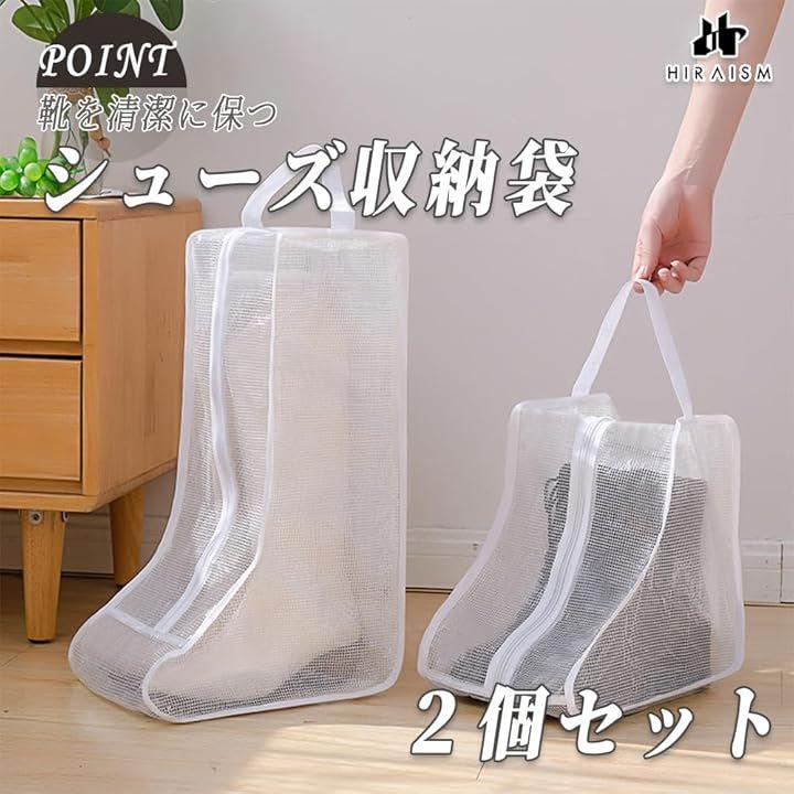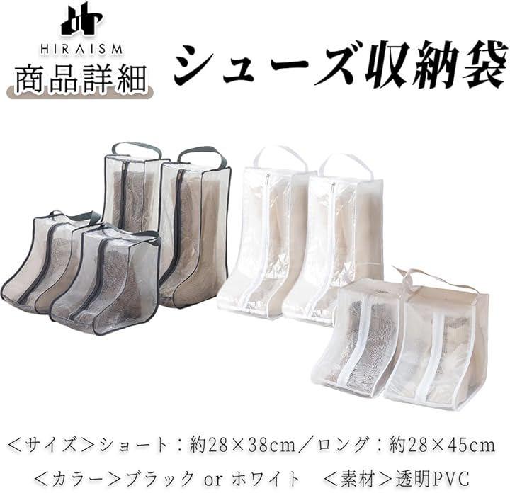 「靴を清潔に保つシューズ収納袋」HIRAISMの靴収納袋は、防塵・防湿性に優れたPVC素材で作られた、長靴や短靴をしっかりと守るための2個セット。