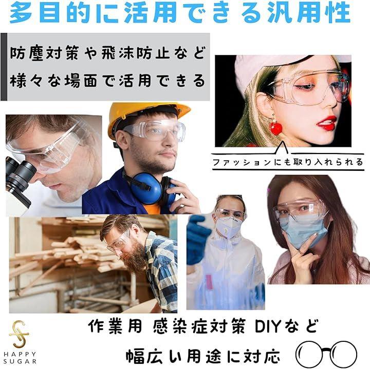 「多目的に活用できる汎用性」防塵対策や飛沫防止など、様々な場面で活用できる多機能な保護メガネです。