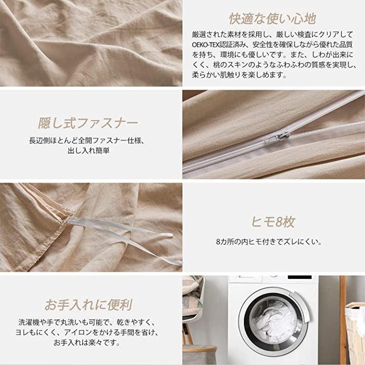 ・「全7色」 白 ┃ グレー ┃ ピンク ┃ むらさき ┃ ブルー ┃ ライトカーキ ┃ セージグリーン・「3サイズ」シングル(150x210cm)┃セミダブル(170x210cm)┃ダブル(190x210cm)・「心を込めた設計」掛ふとんカバー:片側全開仕様とYKKファスナーを採用、スムーズな開閉と出し入れを実現、8カ所の内ヒモ付きでズレになりにくい。