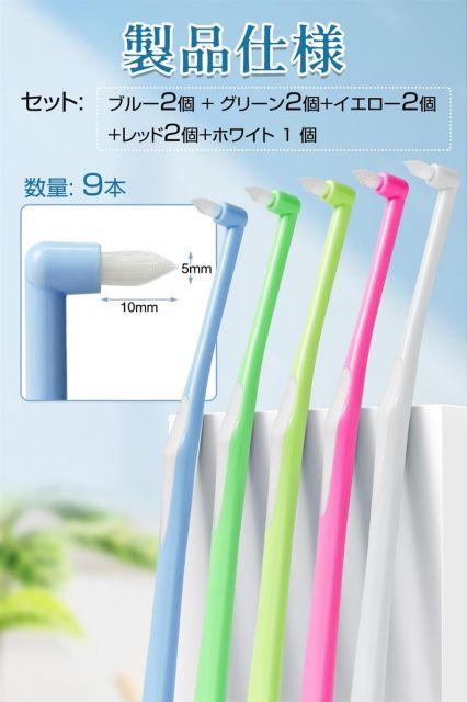 ✅タフトブラシ内容:9本入(5色)ワンタフト歯ブラシやわらかめ矯正用歯ブラシ入りやすい歯間清掃。サイズブラシ部:直径5mm×10mm、全体:165mm×12mm、穴毛の材質:PBT、ハンドル:ポリプロピレン