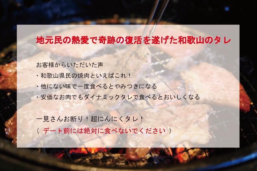 3営業日以内に発送≪新品未開封品≫和歌山県民のソウルフード!50年以上前から変わらない味!!県民に愛されて続けてきた味です。コロナウィルスの影響により売り上げが悪化し一度は倒産したものの、皆様の熱烈なご指示を得て、ここに復活しました。 パンチの効いた味噌味の中にふんだんに使用したニンニクが人気の秘訣です。 石臼でじっくりとすりつぶしながら原材料を混ぜ合わせることで、風味がしっかりと残されています。 ニンニクの風味が食欲を強烈にかきたて、ダイナミックタレをたっぷりとつけたお肉と真っ白なご飯を口いっぱいに頬張りたくなります。【重要】メーカーによる商品リニューアルに伴いパッケージ(内容量も含む)変更が行われた場合、新パッケージでお届け致します事ご了承願います。