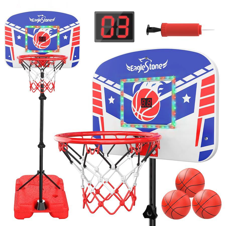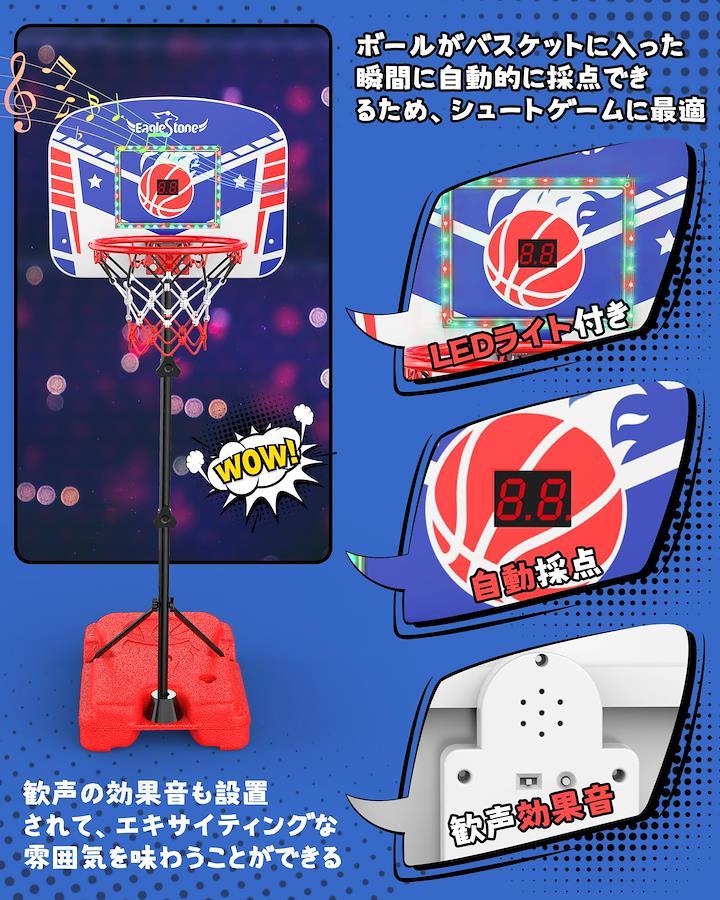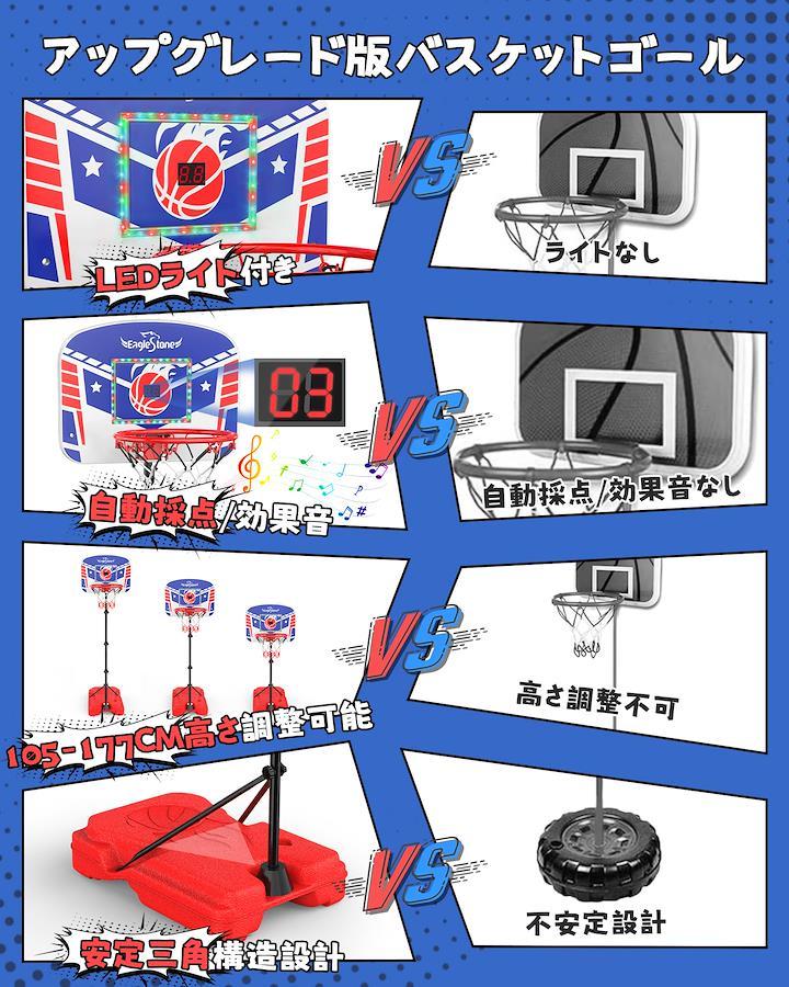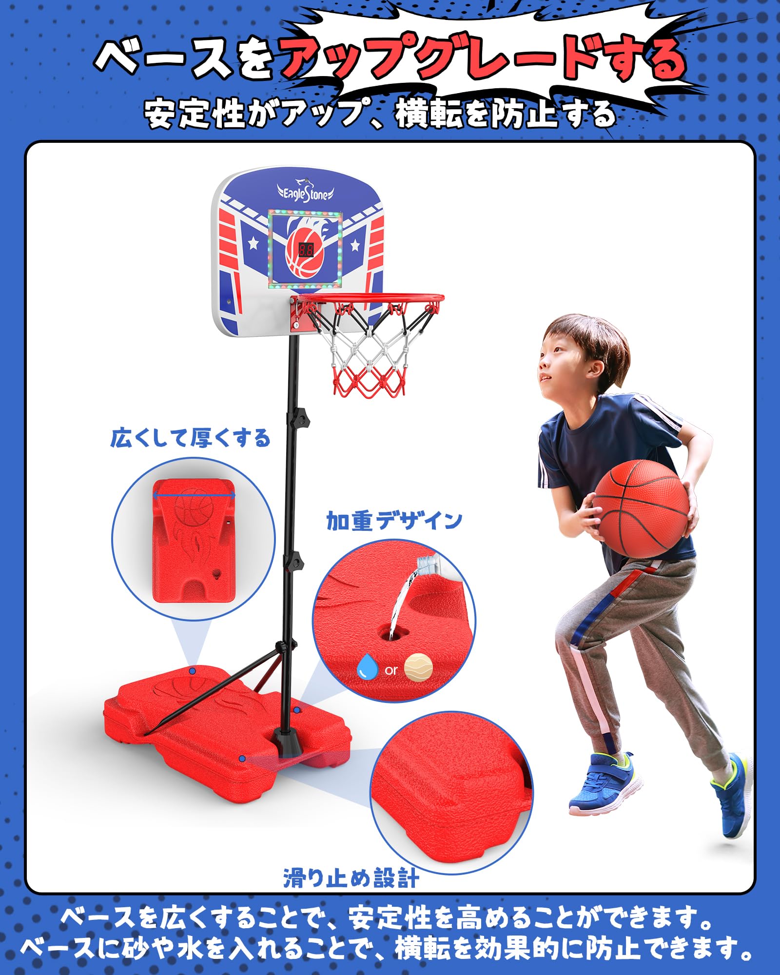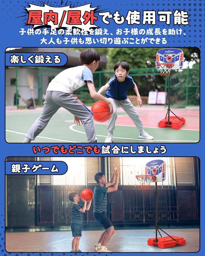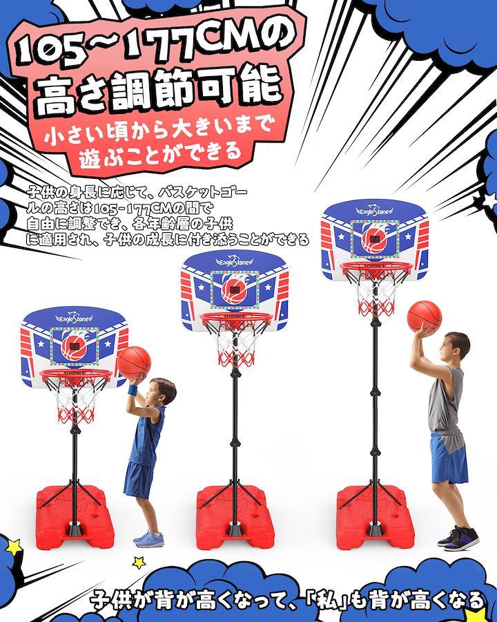 【105~177cmの高さ調節可能】子供が背が高くなって、「私」も背が高くなる。小さい頃から大きいまで遊ぶことができる。子供の身長に応じて、バスケットゴールの高さは105-177cmの間で自由に調整でき、各年齢層の子供に適用され、子供の成長に付き添うことができる。子供の成長に合わせて高さを変えれるので長く遊べます。子供から大人まで家族全員使えてお孫さんの里帰り用にもオススメです。 【安定した三角構造ベース&横転を防止&高品質素材】安定した三角構造設計により、ベースを広くすることで、安定性を高めることができます。ベースに砂や水を入れることで、横転を効果的に防止できます。高品質の素材で作られ、耐久性が高いと共に、子供にも安全です。 【室内/屋外適用&様々なシーンで活躍】室内でも屋外でも使用できるミニバスケットセットです。リビングルーム、子供の部屋、オフィスなど、室内でもバスケットボールが遊べます。もちろん、室内のほか、屋外でも自由に利用可能です。子供の手足の柔軟性を鍛え、お子様の成長を助け、大人も子供も思い切り遊ぶことができる。ストリートバスケや部活の自主練など様々なシーンで活躍します。いつでもどこでも試合にしましょう。 【LEDライト付き&自動採点&効果音付き】LEDディスプレイ、センサーとスピーカーが搭載されているため、バスケットボールをゴールにシュートしたら、LEDディスプレイが自動的にカウントし、歓声もスピーカーからあげます。エキサイティングな雰囲気が溢れ、臨場感も味わうことができます。 【トレーニングできる親子ゲーム】ボールを3個付きで、一人の運動も、多人のゲームも実現できます。また、出掛ける必要がなく、自宅でもトレーニングできます。室内運動に最適なスポーツトイです。両親と子供は一緒にシュート練習することで親子関係を強化します。週末や休日や仕事の後のストレス解消/運動不足の改善としても素敵です。 【製品保証】万が一初期不良などの場合は、どうぞお気軽にお問い合わせ下さい。こちらは適切な対応をご提供いたします。どうぞ、ご安心ください。