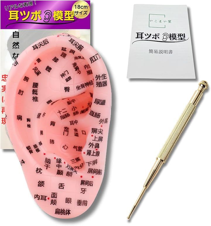 「耳から変わる、毎日の健康」立体耳ツボ模型と耳つぼスティックのセット。