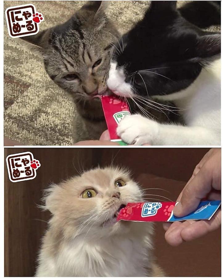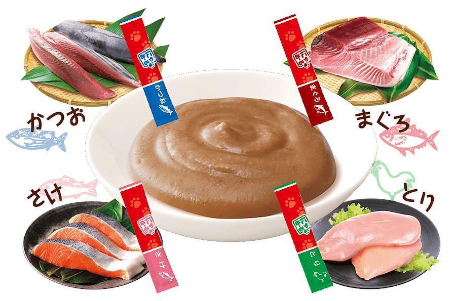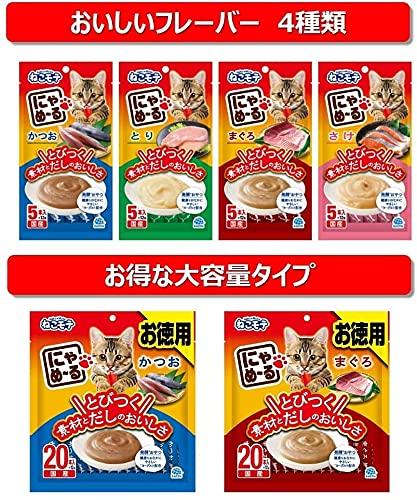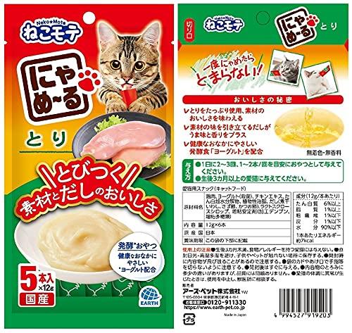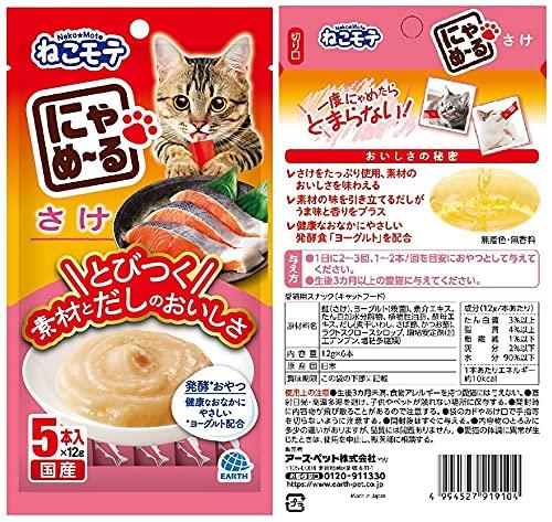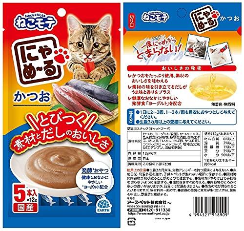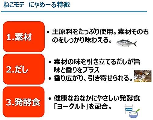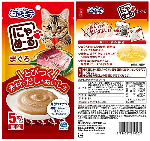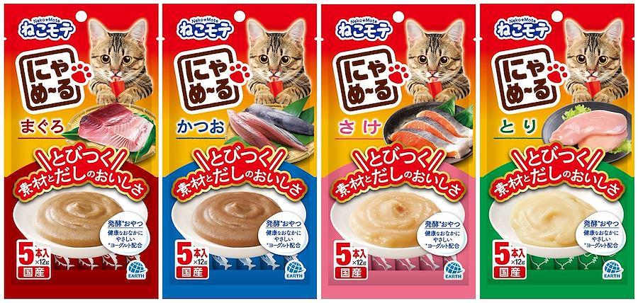 猫用のおやつ ねこモテ にゃめーる!まぐろ・かつお・とり・さけのペーストに、煮干いわし・さば節・かつお節の合わせだしが、旨味の相乗効果によって素材の味をより引き立てます。一度にゃめたら止まらない。食べやすくやみつきになる美味しさです。発酵食ヨーグルトとラクトスクロース(オリゴ糖)配合で、おなかにやさしい。ちゅーるのように手から直接与えられるので、愛猫とのふれあいも楽しめます。バラエティ豊かなので飽きにくい!1日に2~3回、1~2本/回を目安におやつとして与えてください。※本品は生後3ヶ月以上の猫用です。対象年齢以外の猫には与えないでください。