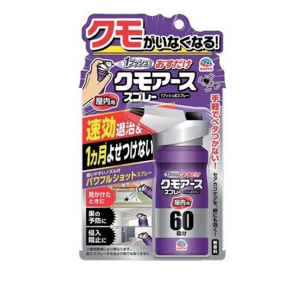 製品の特徴●アース製薬 クモの巣消滅 1プッシュ式スプレー 屋内外兼用(旧:おすだけクモアーススプレー 屋内用)●屋内外のクモ(蜘蛛)を1プッシュで予防&駆除&侵入防止。●簡単にクモ予防!3ヵ月に1度(※1)で簡単!屋内外のクモがいなくなる!●クモが巣を張りそうな場所や侵入しそうな場所にプッシュしておくだけで、約3ヵ月間クモをよせつけません。●屋内外でクモを見かけた時も直接駆除できます。●アース独自のパワフルショットスプレーで、高い所やすき間の奥まで薬剤が届きます。●スプレーしても汚れない処方なので、家の中でも手軽にお使いいただけます。●クモの卵や危険なセアカゴケグモにも効果があります。●無香料●対象害虫:クモ類