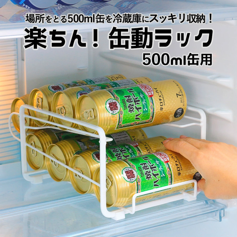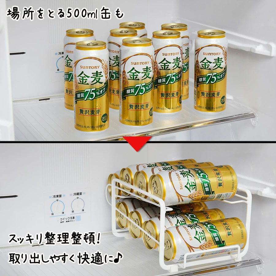 <500ml缶用>冷蔵庫の中で散らかりやすい500ml飲料缶をスッキリ収納できます。缶を上の段から転がし、下の段から冷えた缶を取り出します。「冷えた缶」と「新たに取り出す缶」との面倒な入れ替えが不要です。500mlの飲料缶8本を収納できます。錆びにくいポリエチレン被膜のワイヤー製です。【商品サイズ】約幅19.3×奥行31×高さ13.6cm(すべり止め含む)【適応設置サイズ】冷蔵庫の棚の高さ19cm以上※19cm未満の場合は使用できませんのでご注意ください。【重さ】410g【商品材質】本体/スチールにPE被膜すべり止め/合成ゴム