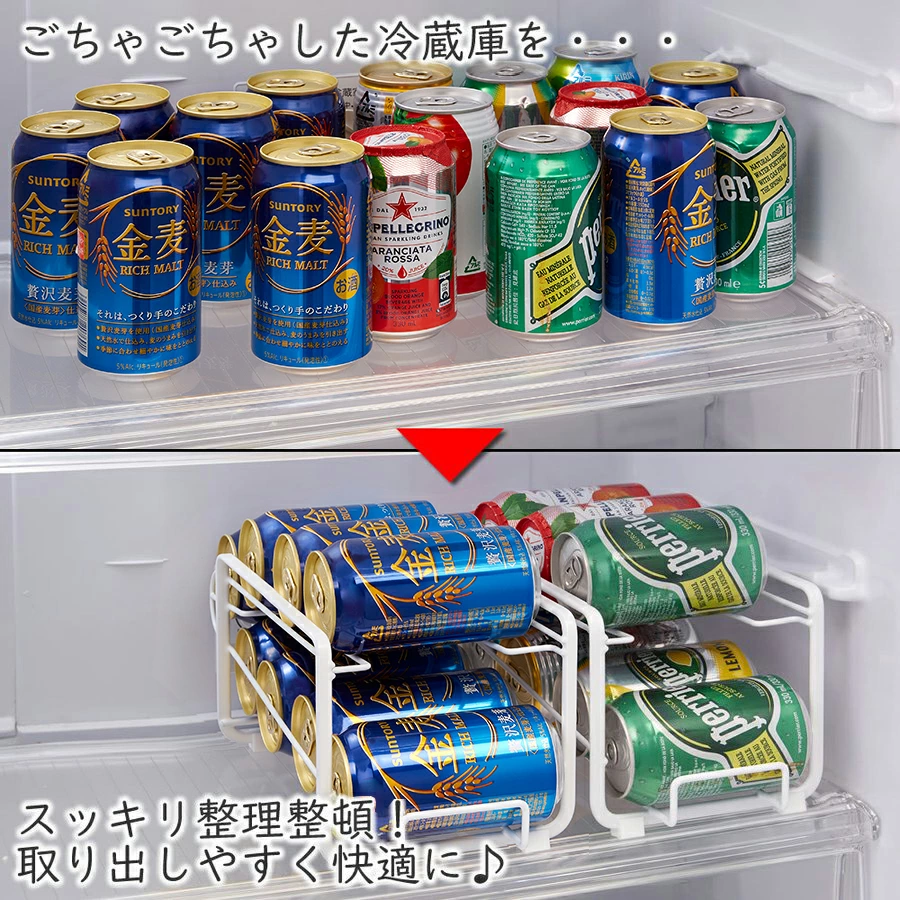 <350ml缶用>冷蔵庫の中で散らかりやすい350ml飲料缶をスッキリ収納できます。缶を上の段から転がし、下の段から冷えた缶を取り出します。「冷えた缶」と「新たに取り出す缶」との面倒な入れ替えが不要です。350mlの飲料缶8本を収納できます。錆びにくいポリエチレン被膜のワイヤー製です。【商品サイズ】約幅14.7×奥行31×高さ13.6cm(すべり止め含む)【適応設置サイズ】冷蔵庫の棚の高さ19cm以上※19cm未満の場合は使用できませんのでご注意ください。※350ml缶以外、また特殊形状の缶には使用しないでください。※本製品は250ml缶へはご利用いただけません。【重さ】400g【商品材質】本体/スチールにPE被膜すべり止め/合成ゴム