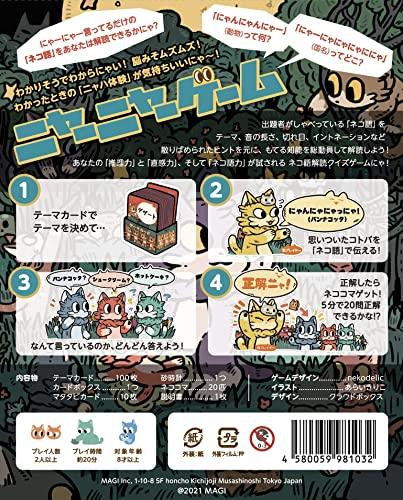 オトナもコドモもネコも遊べるネコ語 解読ボードゲーム! ネコ役のプレイヤーがしゃべるネコ語のジャンル、音の長さ、切れ目、イントネーションなど 散りばめられたヒントを元に、もてる知能を総動員してネコ語を解読! 2~4人用 対象8歳以上 プレイ時間 約20分