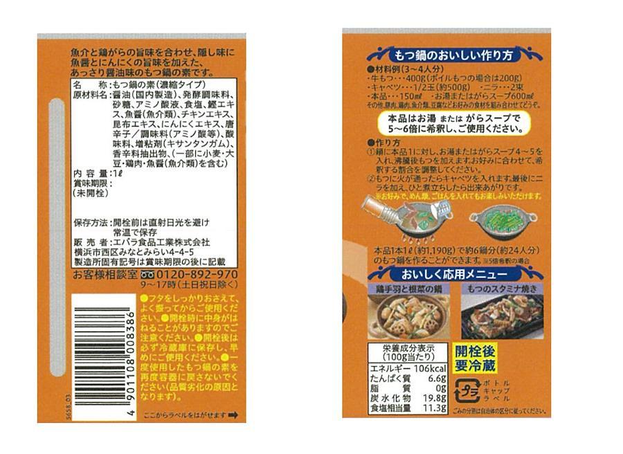●材料例(3~4人分)・牛もつ…400g(ボイルもつの場合は200g)・キャベツ…1/2玉(約500g)・ニラ…2束・本品…150ml・お湯またはがらスープ600ml その他豚肉、鶏肉、魚介類、豆腐などお好みの食材を組み合わせてどうぞ。 本品はお湯またはがらスープで5~6倍に希釈し、ご使用ください。 ●作り方【1】鍋に本品1に対し、お湯またはがらスープ4~5を入れ、沸騰後もつを加えます。お好みに合わせて、希釈する割合を調整してください。【2】もつに火が通ったらキャベツを入れます。最後にニラを加え、ひと煮立ちしたら出来あがりです。※お好みで、めん類、ごはんを入れてもお楽しみいただけます。本品1本1L(約1,190g)で約6鍋分(約24人分)のもつ鍋を作ることができます。※5倍希釈の場合