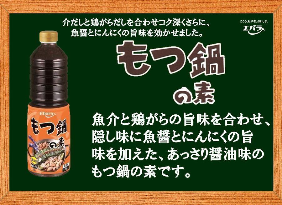 魚介と鶏がらの旨味を合わせ、隠し味に魚醤とにんにくの旨味を加えた、あっさり醤油味のもつ鍋の素です。
