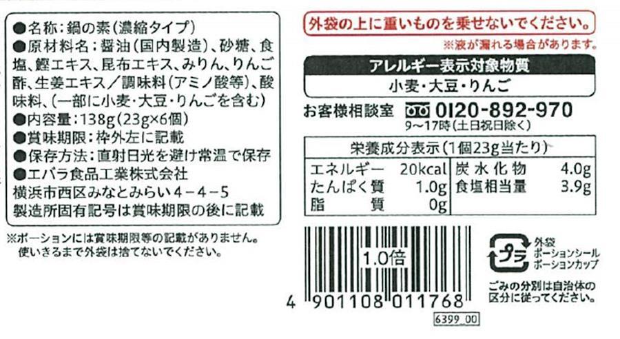 1人で食べるお手軽鍋から、家族で食べるごちそう鍋まで、いつでも作りたい分に合わせて「おいしい鍋」を手軽に作ることができる「1個で1人分鍋の素」です。うすくち醤油をベースに、鰹と昆布の旨みとほんのり生姜を効かせた味わいに仕上げました。寄せ鍋の作り方 1.本品2個と水300mlを鍋に入れます。2.具材を入れて煮込み、火が通ったら出来あがりです。原材料:醤油(国内製造)、砂糖、食塩、鰹エキス、昆布エキス、みりん、りんご酢、生姜エキス/調味料(アミノ酸等)、酸味料、(一部に小麦・大豆・りんごを含む)直射日光を避け常温で保存。【重要】メーカーによる商品リニューアルに伴いパッケージ(内容量も含む)変更が行われた場合、新パッケージでお届け致します事ご了承願います。