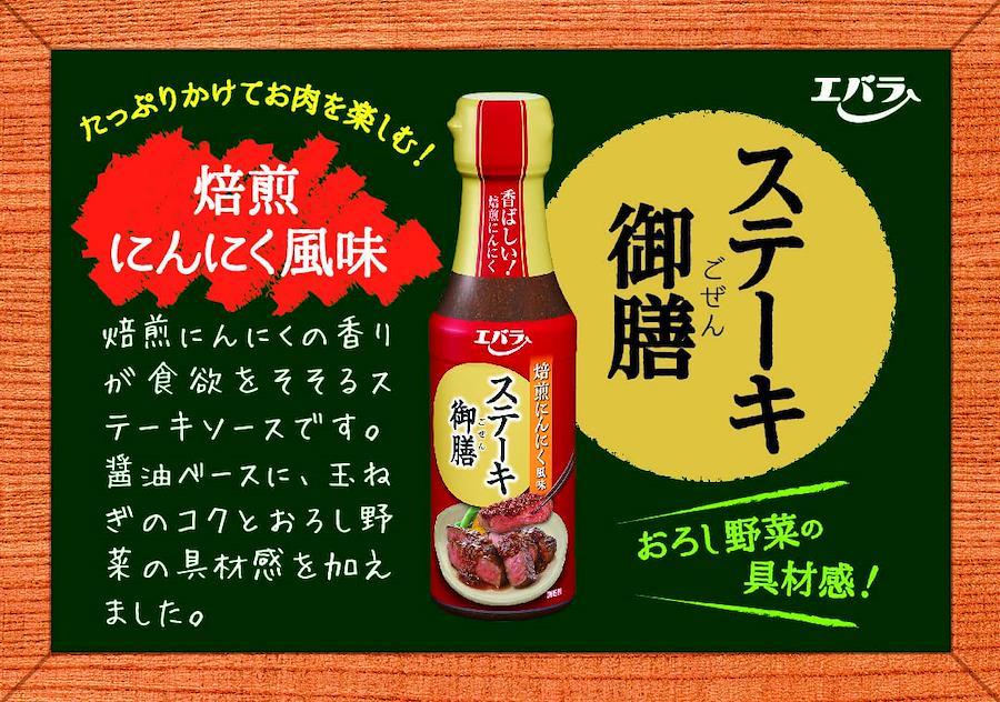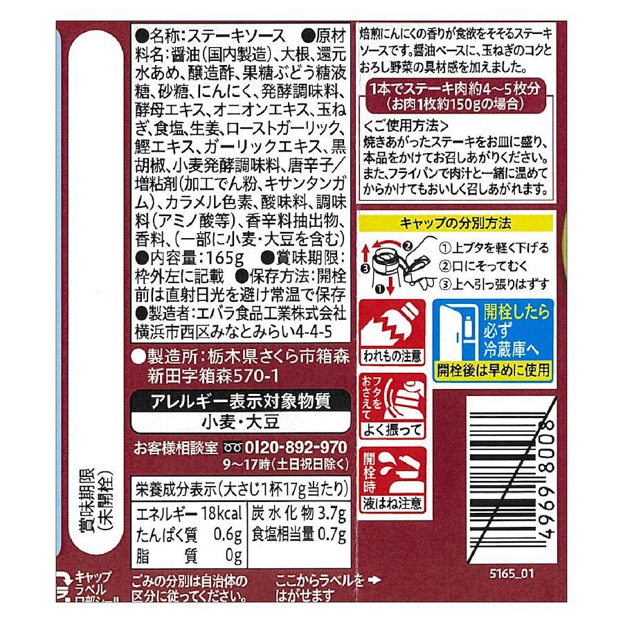 たっぷり野菜がお肉のうまみを引き立てるので、焼いたお肉にかけるだけで、おいしいステーキが食べられる具材入りステーキソースです。焙煎にんにくの香りが食欲をそそるステーキソースです。醤油ベースに、玉ねぎのコクとおろし野菜の具材感を加えました。