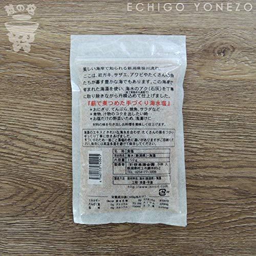美しい海岸で知られる新潟県笹川流れ、この海岸で育まれた海藻を使い薪で煮詰める過程で出る海水のアク(石灰)を丁寧に取り除きながら 丹精込めて仕上げました。海藻のヨード分がたっぷり『薪で煮つめた手作り海水塩』天ぷら、塩焼き、おにぎりなどでお召し上がりください※おにぎり、てんぷら、焼き魚、サラダなど※煮物、汁物のコクを出したいとき※お塩だけの野菜炒め、浅漬けに 材料の味を引き出しお料理を美味しく仕上げます【●原材料】海水(新潟県)、海藻【●内容量】150g【●製造元】(有)日本海企画【●栄養成分表 (100g当たり)】熱量5kcal、タンパク質0g、脂質0g、炭水化物1.1g、食塩相当量86.3g【重要】メーカーによる商品リニューアルに伴いパッケージ(内容量も含む)変更が行われた場合、新パッケージでお届け致します事ご了承願います。