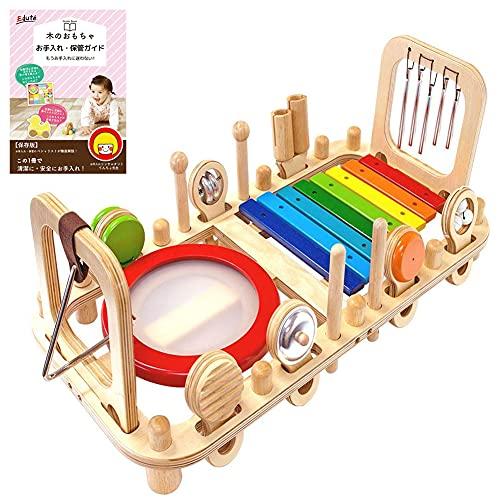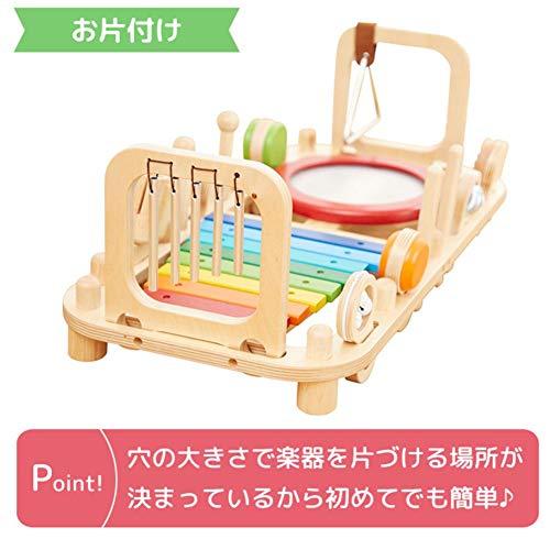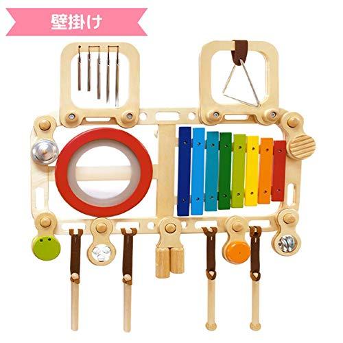 ?メロディーベンチ&ウォールトイ 11の楽器が1つになった欲張りミュージックトイ ※音階は合っていないのでご注意ください※ ?11種類の楽器で指先トレーニング 太鼓・木琴・トライアングル・チャイム・ベル・カスタネット・シンバル・ウッドブロック・ギロ・タンバリン・マラカスの11種類の音遊びが楽しめる大型トイ。I’m TOY アイムトイシリーズは、「握る」「つなげる」「通す」「結ぶ」といった指先の動きを追求して作られた木のおもちゃです。※素材の特性上、音階は調律されていません。 ?【対象年齢】12ヶ月~【内容】本体×1、バチ×2、マレット×2、ベル・カスタネット・シンバル・ダブルギロ・ギロ・タンバリン・マラカス×各1、ヒモ×11 【商品サイズ】商品サイズ:高21.5×幅29.5×奥59cm 重量:2600g 【材質】ゴムの木、プライウッド、MDF、PP、布、鉄、ゴム 【生産国】タイ ?穴の大きさで楽器を片付ける場所が決まっているから初めてでも簡単。壁にかけておけるので収納場所も取りません。壁に設置して遊ぶ事もできます。 ?ヨーロッパの安全基準のCEに合格しなめても安全な塗料を使用しています。 また天然のゴムの木でできた環境にやさしい素材を使用しています。