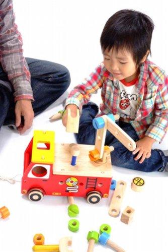 国:タイ 対象年齢:2才頃 サイズ:W29×H18×D18cm 材質:ゴムの木 ☆消防車の多機能プルトーイ かわいい消防車の車体のサイドや荷台のカバーにあるネジ穴に、木製のドライバーやレンチ、トンカチを使ってネジ回しやペグ打ちをしたり、ボリュームたっぷりのパーツを組み合わせて遊べます。タイヤにはお部屋の床を傷つけないゴム加工が施されているのでママも安心。 付属品:本体×1、本体カバー×1、ネジ×3種(6本)、トンカチ×1、六角レンチ×1、マイナスドライバー×1、木製パーツ(4種)×6、S字ペグ×2 ECマーク付